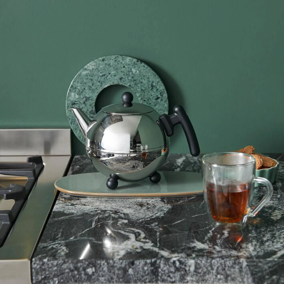 De Bredemeijer Duet Bella theepot is vervaardigd uit glanzend roestvrij staal. De theepot is dubbelwandig waardoor de inhoud langer op temperatuur blijft. De Bredemeijer theepot heeft een inhoud van 1,2 liter en is voorzien van een zwarte kunststof greep. Gebruik de pot voor het zetten en uitschenken van thee.