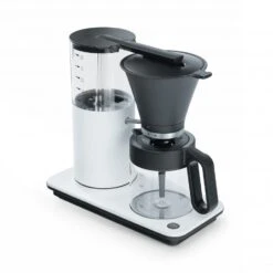 De koffiemolen heeft aan de zijkant een aan-/uitschakelaar, en een aan de voorzijde steunen waarop u de filterdrager kunt rust. Zodra u de drager in de steunen legt, tegen de activatieknop aan, start de molen automatisch.