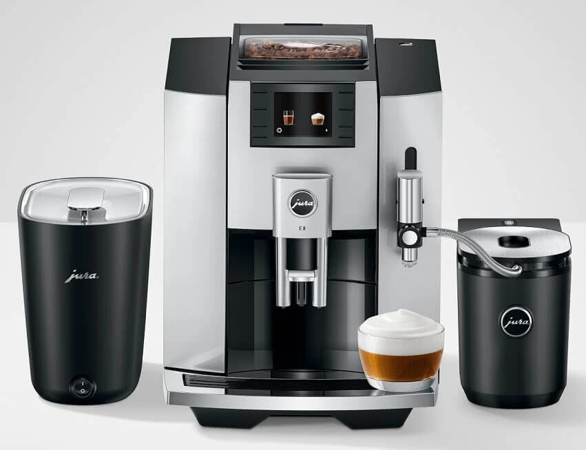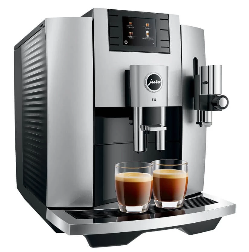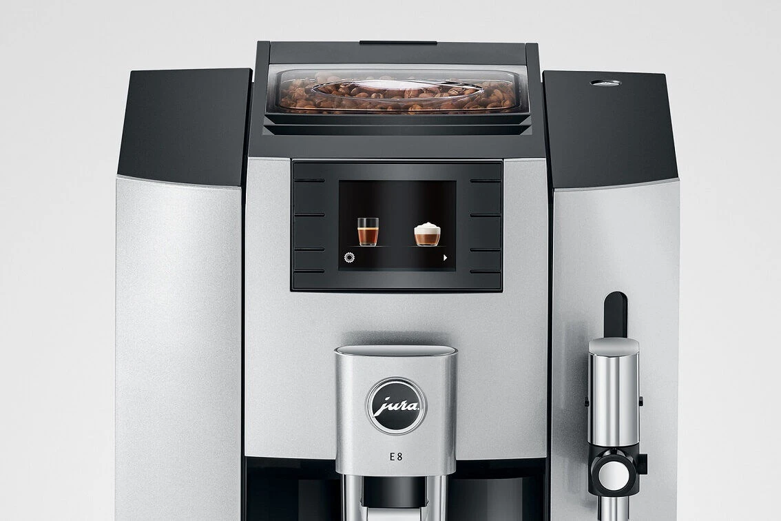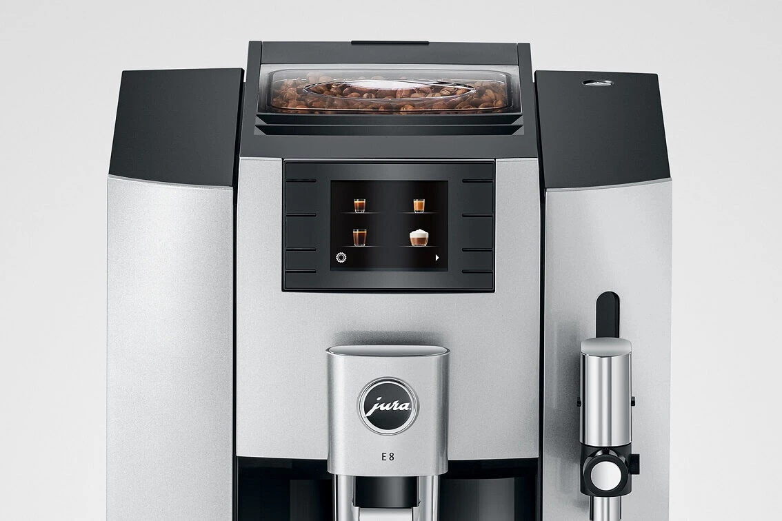 Met de JURA E8 zet u verschillende koffiespecialiteiten, zoals latte macchiato en espresso. De E8 is een zeer compacte volautomatische espressomachine die met 1 druk op de knop cappuccino en 12 andere individueel programmeerbare specialiteiten kan bereiden uit hele of gemalen koffiebonen. De machine wordt heel eenvoudig aangestuurd vanaf het grote 2,8″ kleurendisplay aan de voorzijde.