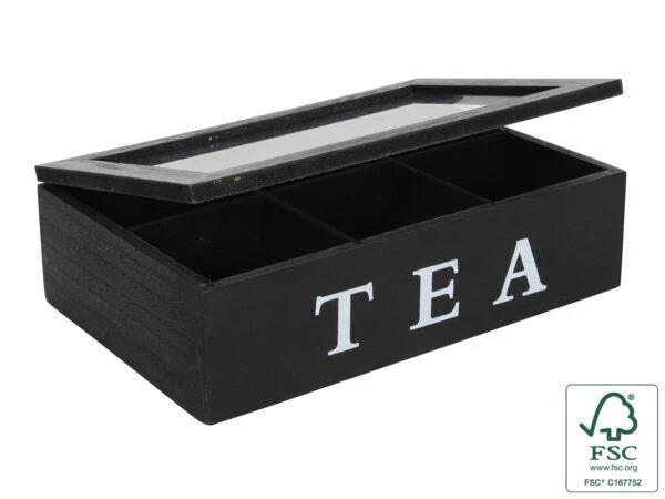 De theedoos van Oldenhof is gemaakt van glas en hout met een zwarte kleur. De kist heeft een breedte van 24 cm, een lengte van 16 cm en een hoogte van 7 cm. De kist heeft 6 vakjes waar precies een theezakje in past, zo kunt u in één doos tegelijkertijd 6 verschillende soorten thee bewaren.